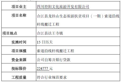 请通过资格审查的参加竞争性谈判人员带好有效身份证、公司介绍信、授权委托书、资质证明等资料的原件与复印件(上述复印件须盖单位鲜章,原件查验后当场退还。于北京时间2019年9月18日9:00,在四川省泸州市合江县荔城大道190号四川符阳文化旅游开发有限公司二楼会议室公开举行合江县龙挂山生态旅游扶贫项目(一期)索道沿线杆线搬迁工程竞争性谈判活动,四川符阳文化旅游开发有限公司根据承诺报价最低价原则确定中选人。