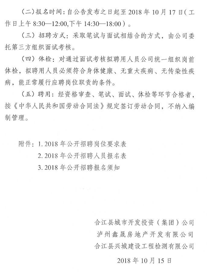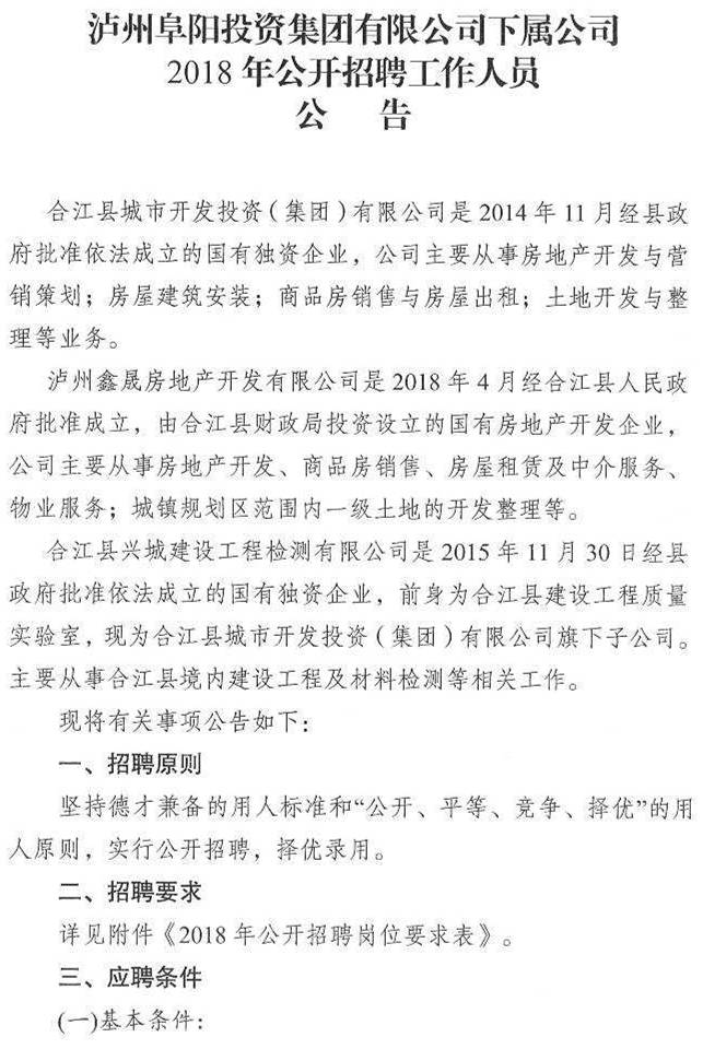 招聘公告:泸州bsports必一体育投资集团有限公司下属公司2018年公开招聘工作人员公告