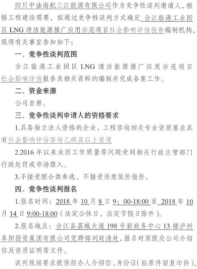 竞争性谈判公告:合江临港工业园区LNG清洁能源推广应用示范项目社会影响评估单位竞争性谈判公告