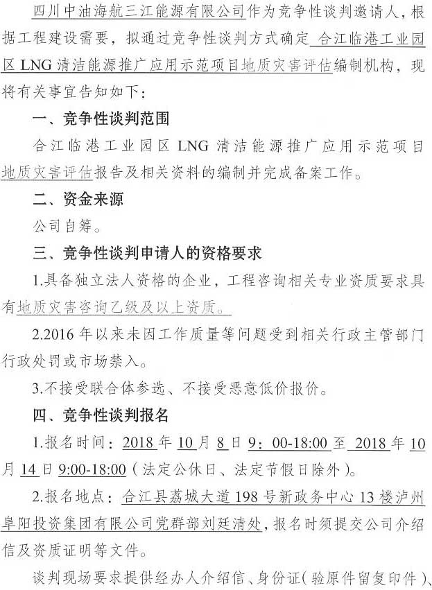 竞争性谈判公告:合江临港工业园区LNG清洁能源推广应用示范项目安全预评价单位竞争性谈判公告