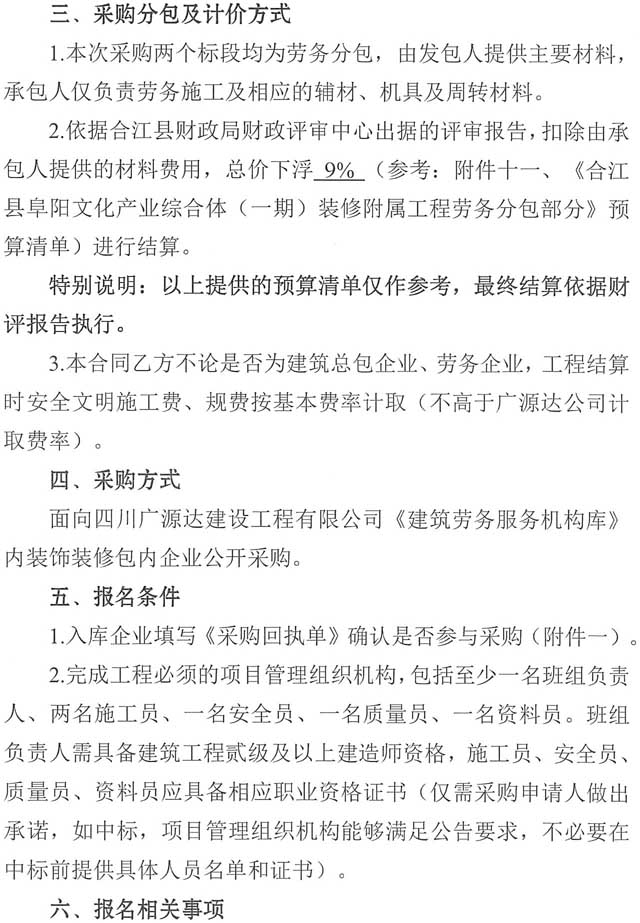 采购公告:四川广源达建设工程有限公司bsports必一体育文化产业综合体(一期)装修附属工程劳务分包企业采购公告(第二次)