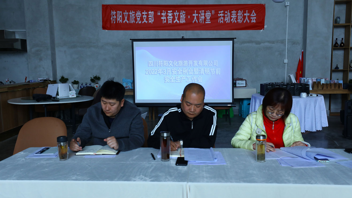 2022 年 3 月 24 日 , 符 阳 文 旅 公 司 召 开 3 月 安 全 生 产 工 作会。 总经理吴平主持会议, 全体员工参加。 会上, 谯棣升 董事长围绕交通运输安全、 在建项目安全、 森林防灭火安全、 地质灾害防范、 酒店经营安全等几个方面作了讲话, 强调每 个员工都有安全责任, 发现违章作业要大胆制止, 保证安全 生产。