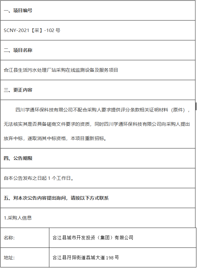 合江县生活污水处理厂站采购在线监测设备及服务项目竞争性磋商结果更正公告