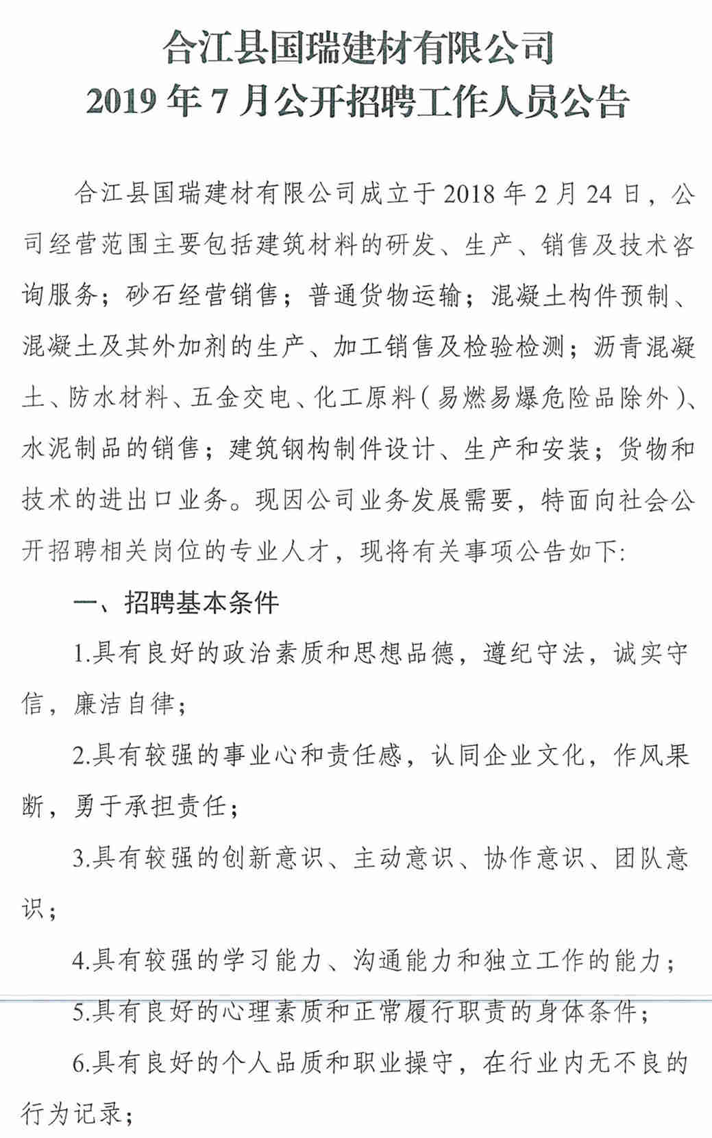 合江县国瑞建材有限公司2019年7月公开招聘工作人员公告