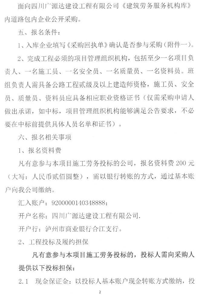 四川广源达建设工程有限公司合江县法王寺镇高速路口至游客中心连接线劳务分包企业采购公告