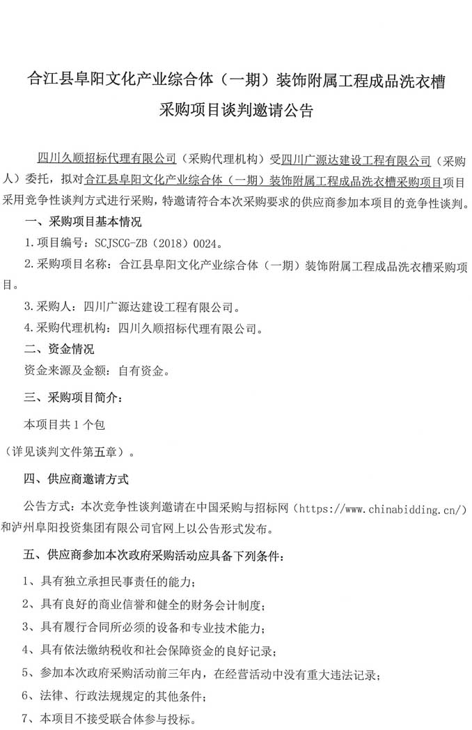 邀请公告:合江县bsports必一体育文化产业综合体(一期)装饰附属工程成品洗衣槽采购项目谈判邀请公告