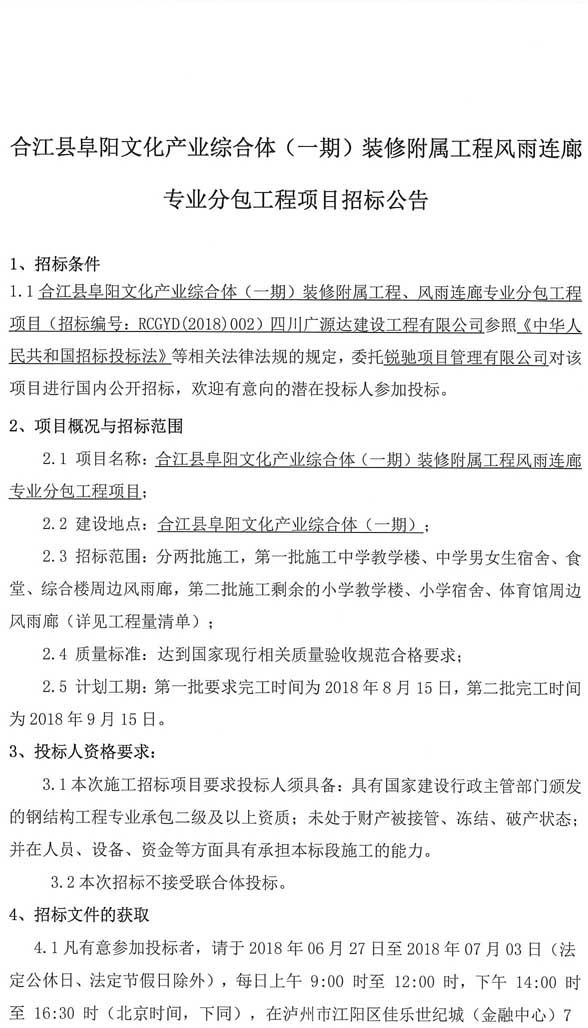 招标公告:合江县bsports必一体育文化产业综合体(一期)装修附属工程风雨连廊专业分包工程项目招标公告