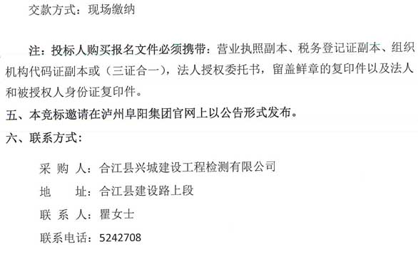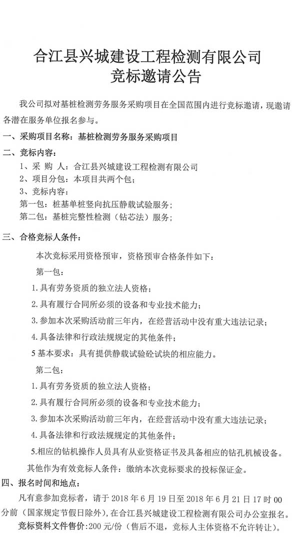 邀标公告:合江县兴城建设工程检测有限公司竞标邀请公告