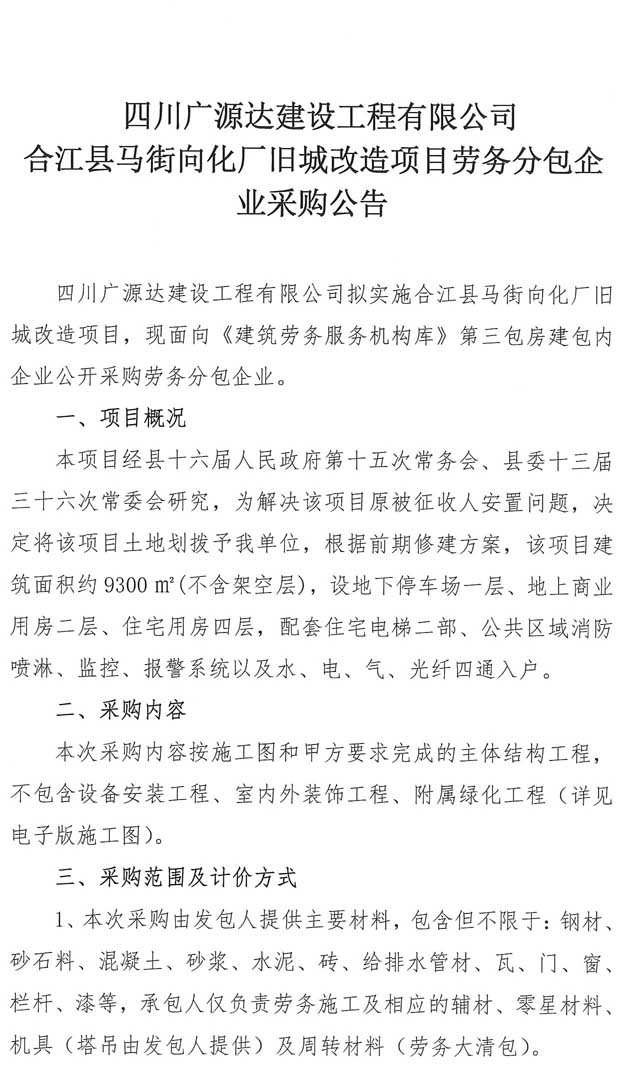 采购公告:四川广源达建设工程有限公司合江县马街向化厂旧城改造项目劳务分包企业采购公告