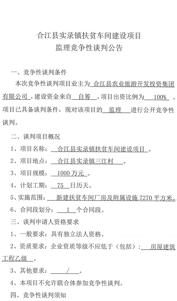 合江县实录镇扶贫车间建设项目监理竞争性谈判公告