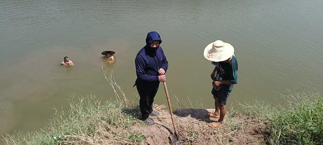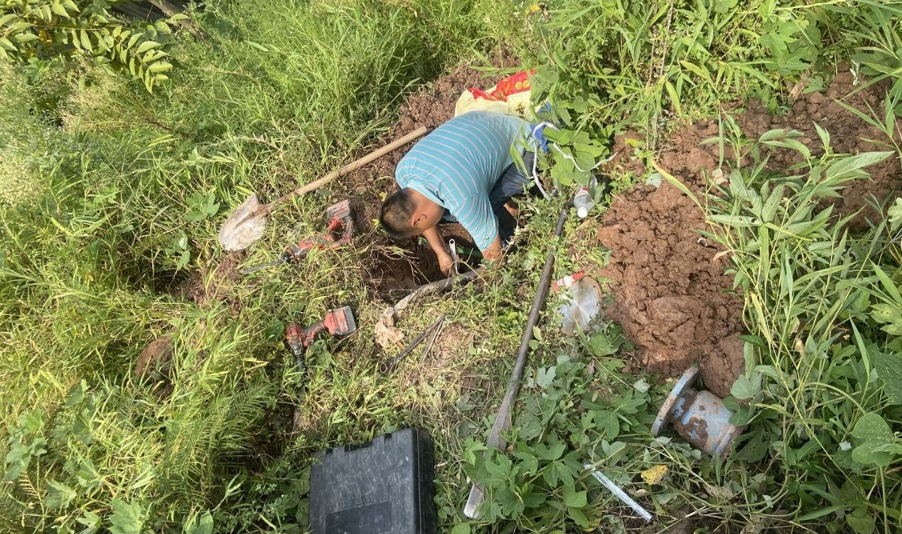供水中心负责人刘世江、 一线员工共同检查真龙镇武民村供 水管线是否存在漏水情况,确保武民村供水正常