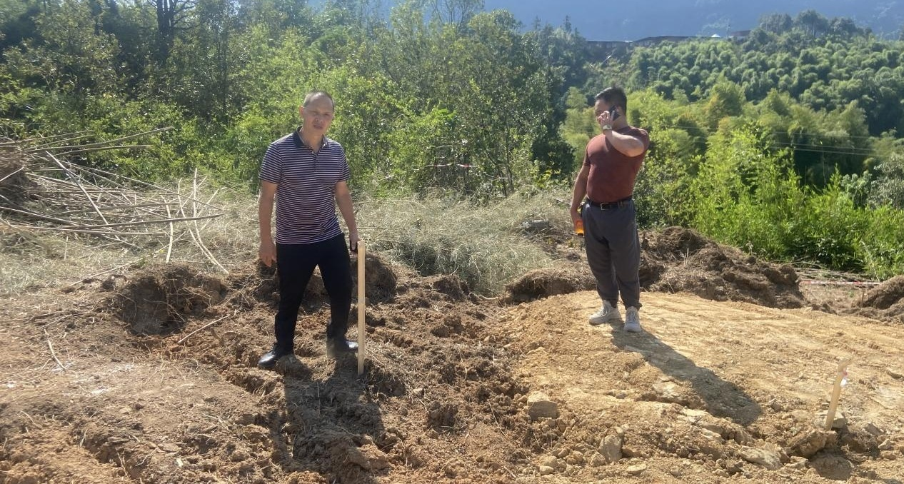 凤鸣片区负责人陈裕宁会同水务局、 设计单位确定凤鸣镇大 茅山供水站进厂公路