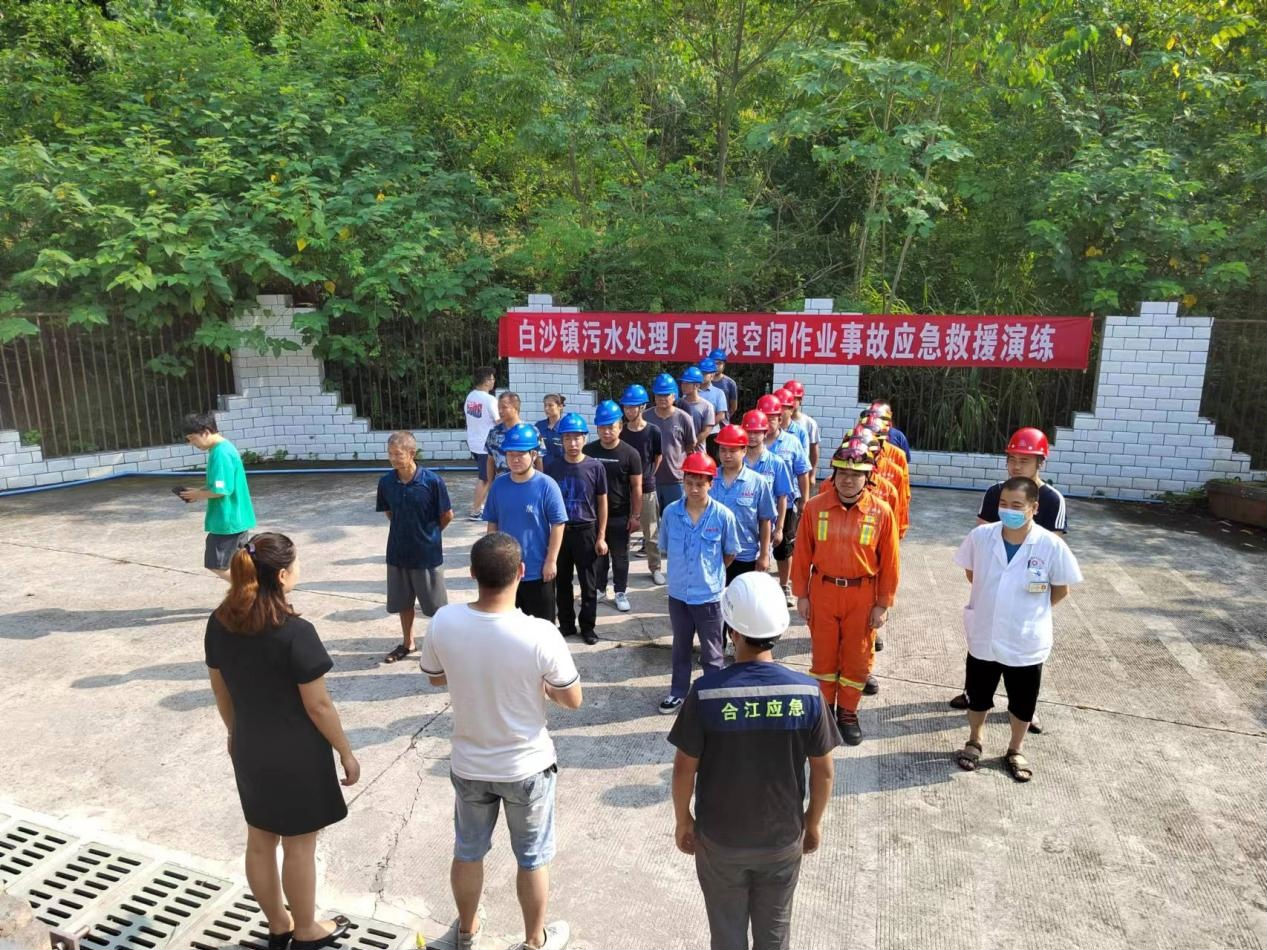 2022 年 8 月 5 日, 白沙镇人民政府、 江北消防中队、 白沙卫生院和泸州汇鑫环保科技有限公司联合在白沙镇城市生活污水处理厂开展有限空间作业应急演练, 白沙镇副镇长周雪莲、 安办主任牟叶奎、 江北消防中队指导员王小峰、 汇 鑫公司副经理刘可参加了本次演练。