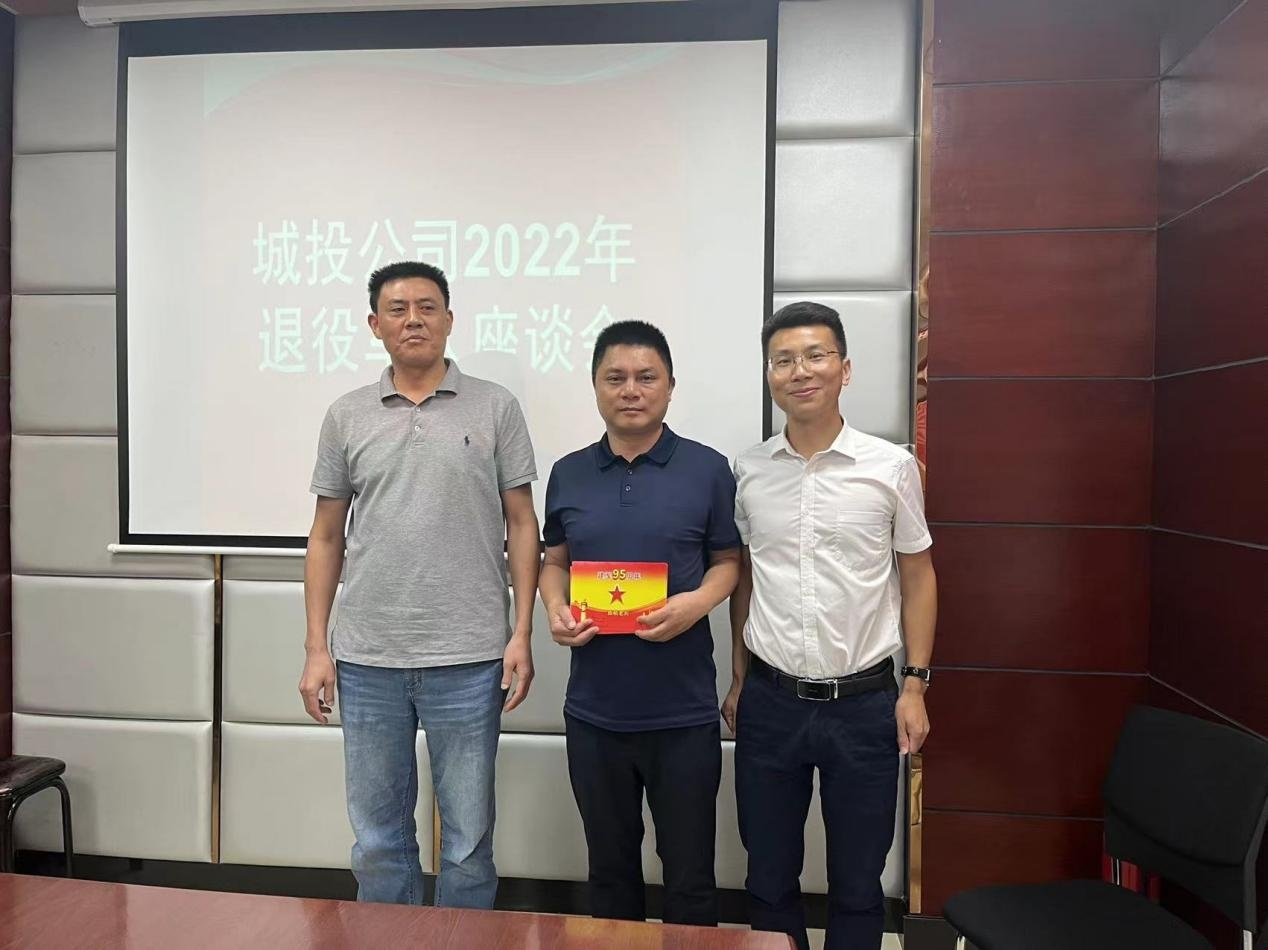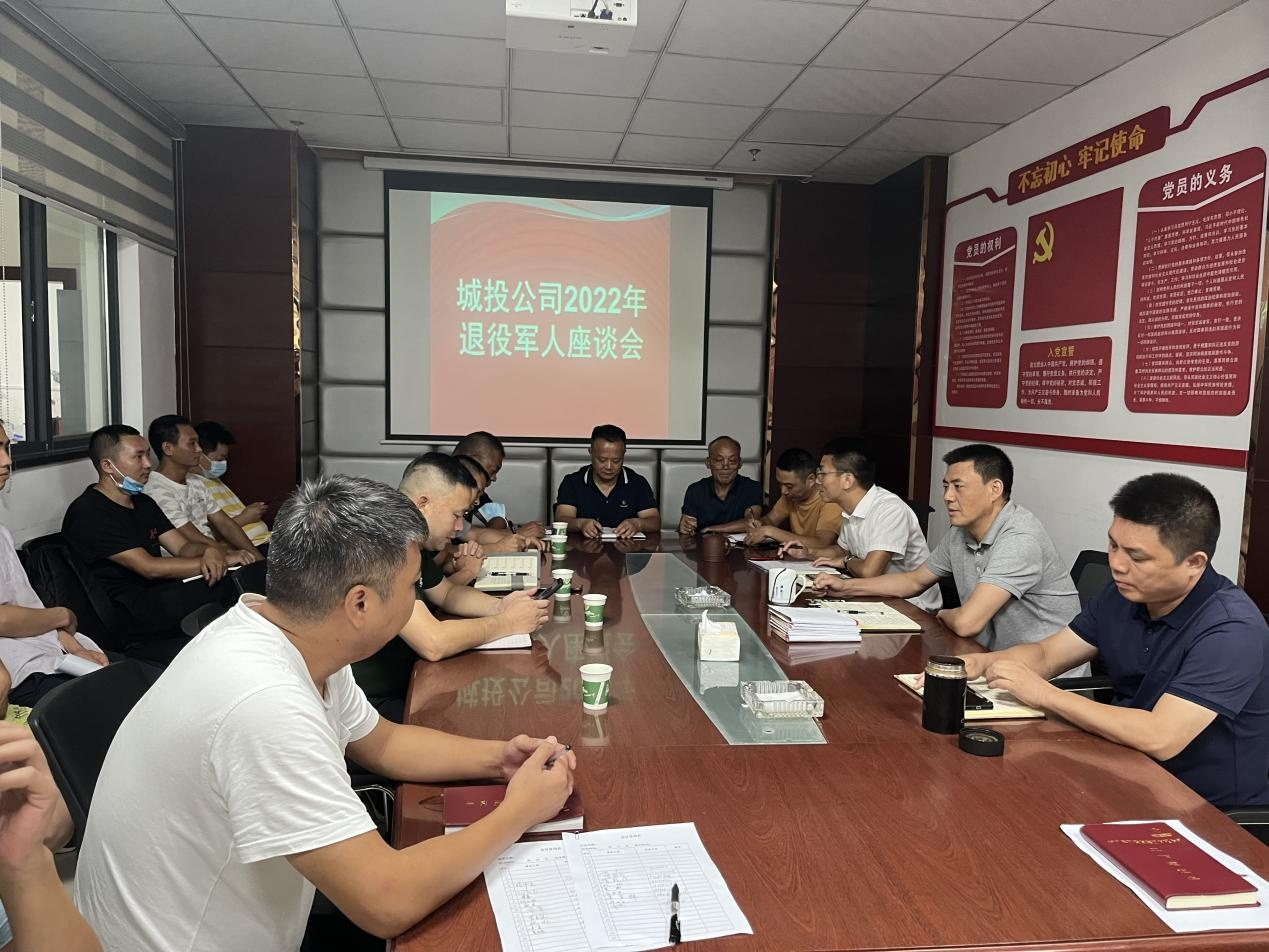为庆祝中国人民解放军建军 95 周年, 2022 年 8 月 1 日 下午, 城投公司董事长兼总经理鞠志良、 副总经理陈云峰组 织召开退役军人座谈会。