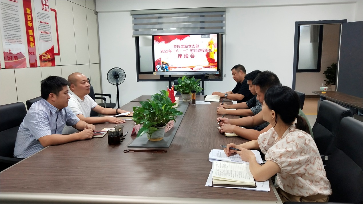 为扎实做好拥军优属 、 拥政爱民工作 , 在 “ 八 一 ” 建军节来临之际, 符阳文旅党支部开展 “ 八一 ” 慰问活动, 组织文旅 公司工作的退役军人召开座谈会, 了解他们的工作和生活情 况, 为他们送上慰问金, 并致以节日的祝福。 退役军人表示 感受到公司的关怀和爱心,在今后的工作中发挥军人本色, 为公司发展贡献力量。