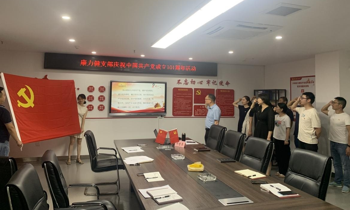 为庆祝中国共产党建党 101 周年, 7 月 1 日, 康力健党支部开展 “七一” 主题党日活动, 通过唱红歌、 重温入党誓词、 支部书记讲党 课等多种形式, 教育引导党员干部不忘初心, 知行合一, 以实际行动 迎接党的二十大胜利召开。