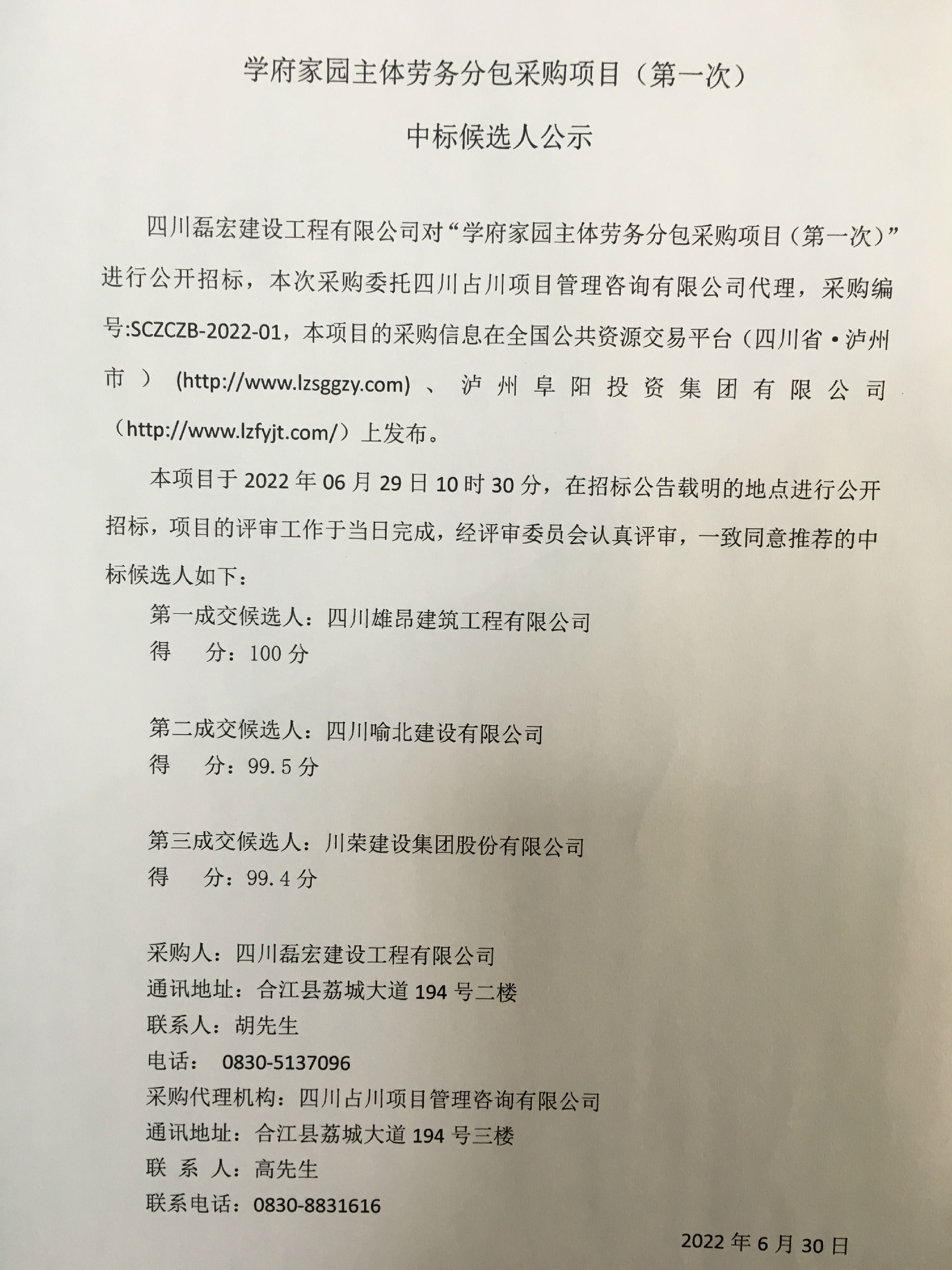学府家园主体劳务分包采购项目(第一次)中标候选人公示