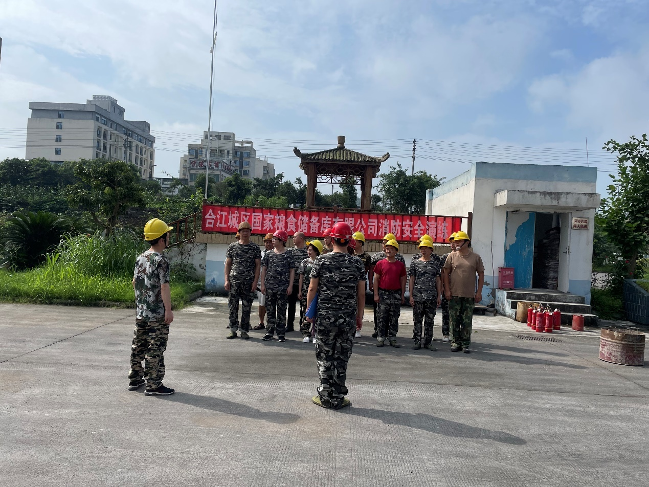 2022 年 6 月 24 日, 合江城区国家粮食储备库有限公司组 织员工进行了消防应急演练。 本次演练主要针对初期火灾的 扑救、 控制、 火场协调指挥、 物资转移、 火场人员疏散引导、 灭火器材的使用及现场灭火的演练。