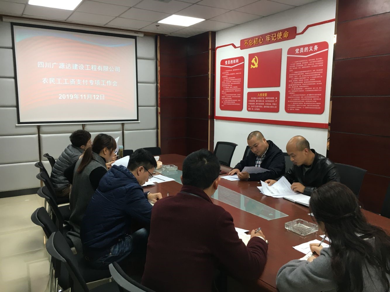 2019年11月12日,四川广源达建设工程有限公司谯棣升董事长主持召开农民工工资支付专项工作会,公司各部门负责人、项目经理参会。